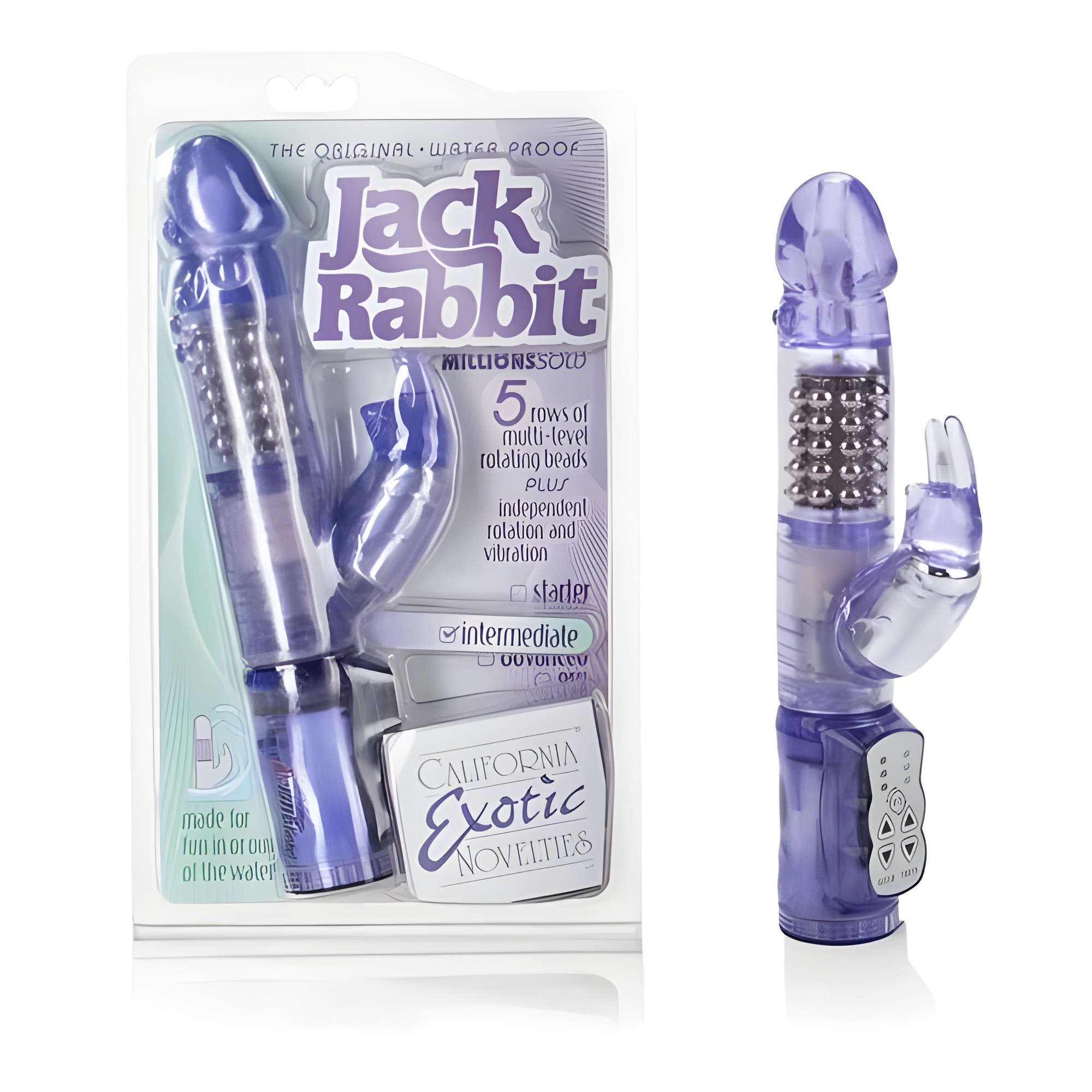 Meet the revamped Jack Rabbit with Floating Beads! This waterproof vibrator features a soft jelly shaft with rotating beads for enhanced pleasure.
