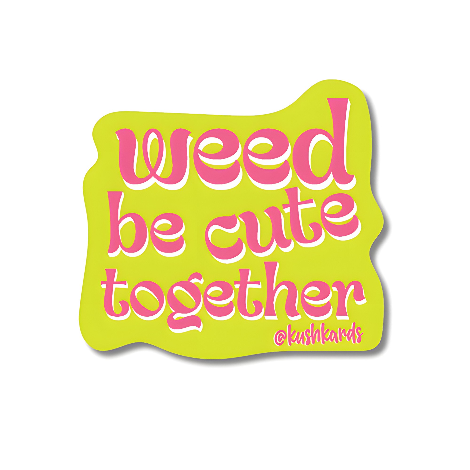 Share a fun sentiment with the 'Weed Be Cute Together' sticker! This lively lime green sticker features playful pink script, perfect for adding humor and a splash of color to your day.