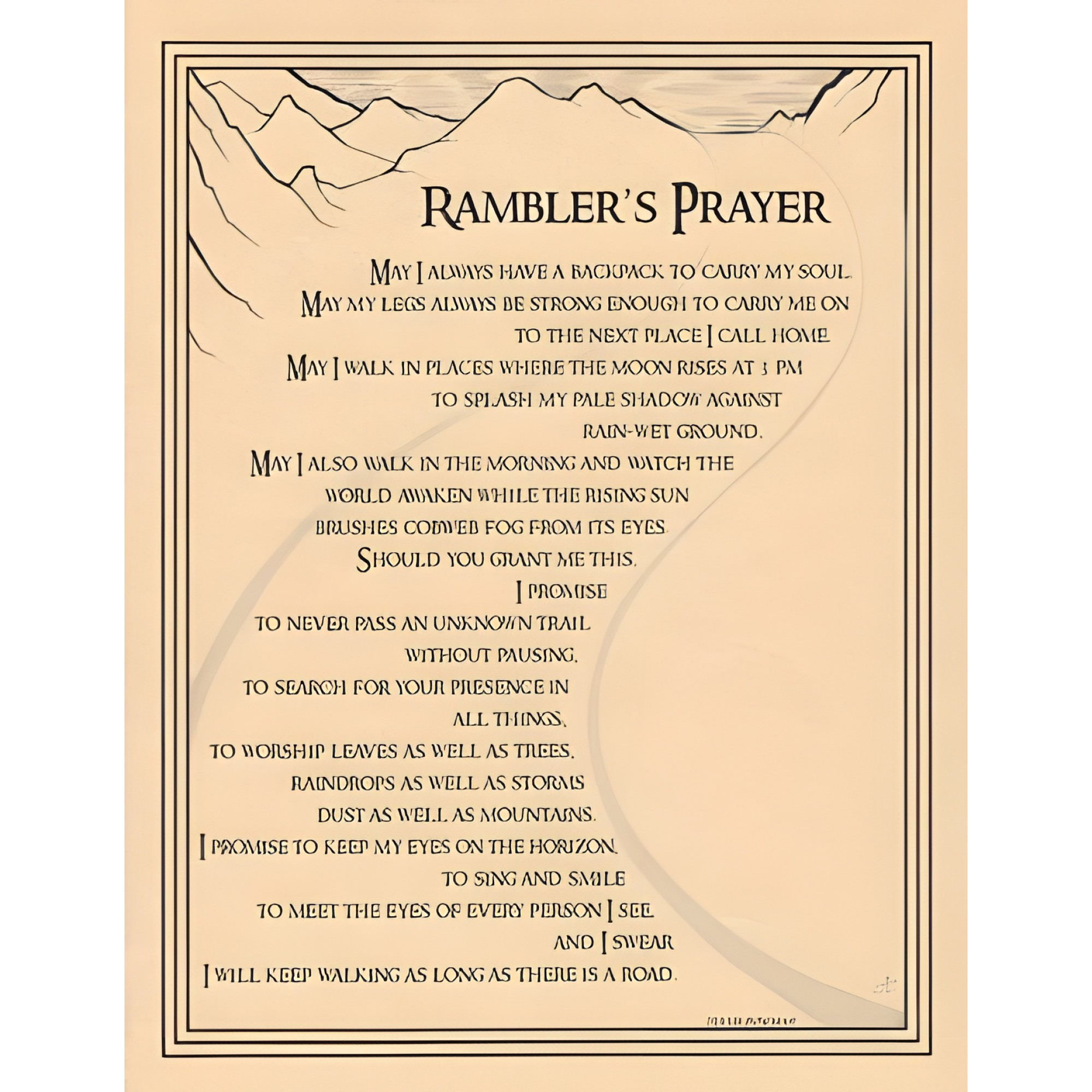 The Rambler's Prayer Poster is a beautiful reminder of resilience and strength. I've got it in my meditation space, and it inspires me every day. The quality is excellent, and it serves its purpose beautifully.